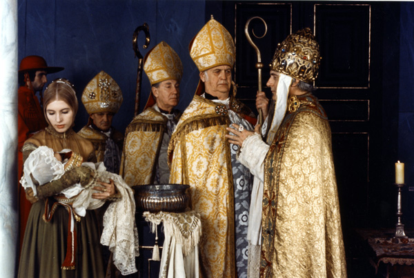 なお、映画の中でチェーザレは赤い服をまとっていますが、これは「緋の衣」といって枢機卿のユニフォームですんで、この劇中の時点で“イタリアの信長”ことチェーザレはまだ還俗して軍人になってはおらず、枢機卿としてバチカンにあったということですな。写真の奥、枢機卿の「緋の衣」を着ているのがチェーザレです。一番右の「三重冠」というやつをかぶっているのが教皇、つまり“パパ”です。
