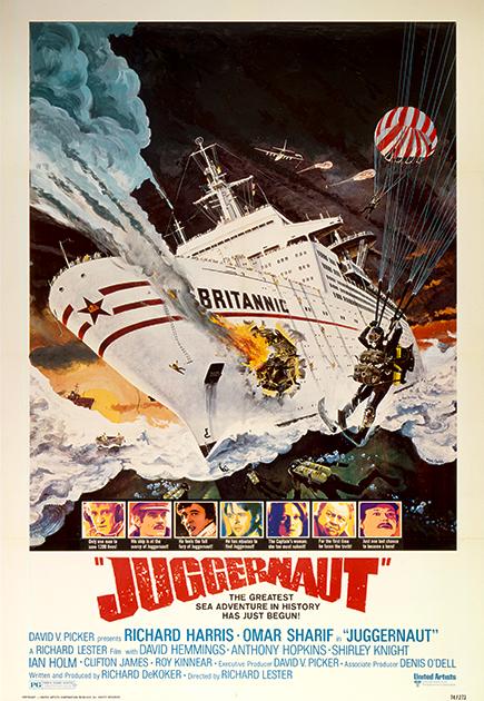 1974年、イギリス映画『ジャガーノート』は、荒れ狂う北大西洋を舞台にしたサスペンス大作として製作・公開された。舞台となるのは総トン数約2万5千トンの豪華客船ブリタニック号。本船が大西洋横断の最中、何者かによって7つの爆弾を仕掛けられ、“ジャガーノート”を名乗る犯人が身代金として50万ポンドを要求する。荒天のため乗客の避難も不可能ななか、約1200人の乗客を救うべく爆薬処理班が派遣され、このシンプルかつ極限的な設定が、2時間近くにわたって観る者の緊張を持続させていく。
