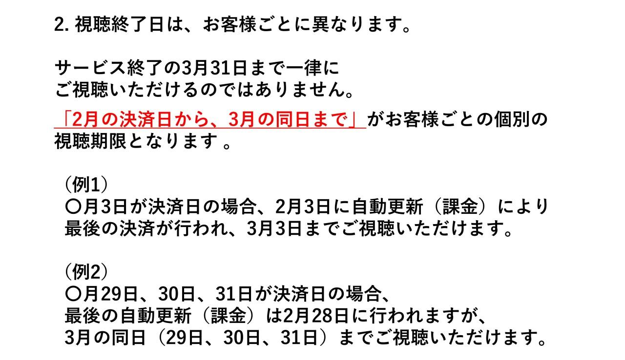 サービス終了に伴うスケジュールのほか、お客様ごとの視聴期限や課金に関する重要なポイントをご案内いたします。