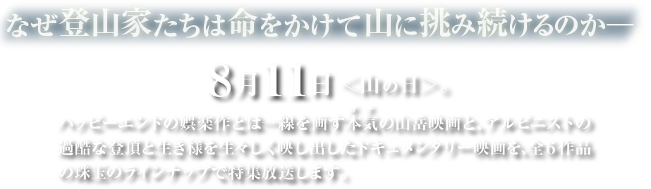ハッピーエンドの娯楽作とは⼀線を画す本気(ガチ)の⼭岳映画と、アルピニストの過酷な登頂と⽣き様を⽣々しく映し出したドキュメンタリー映画を、全6作品の珠⽟のラインナップで特集放送します。