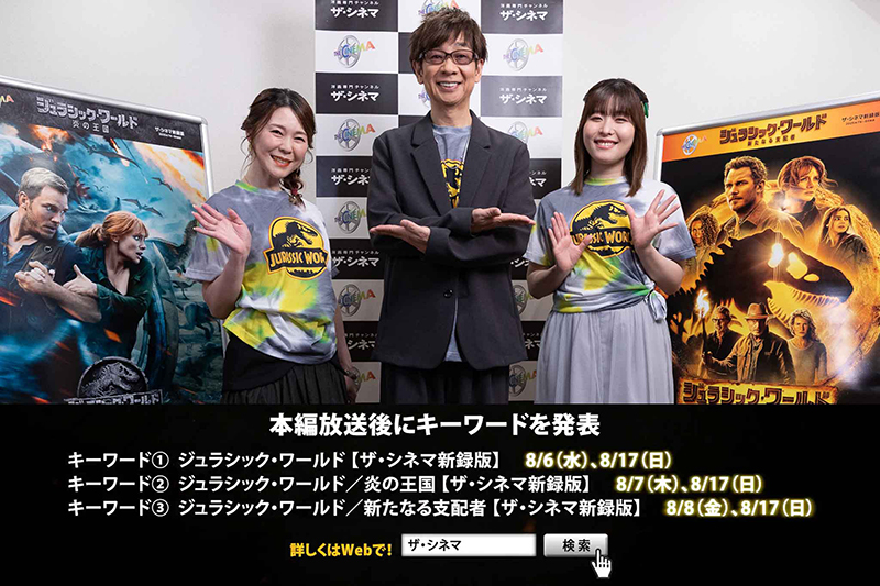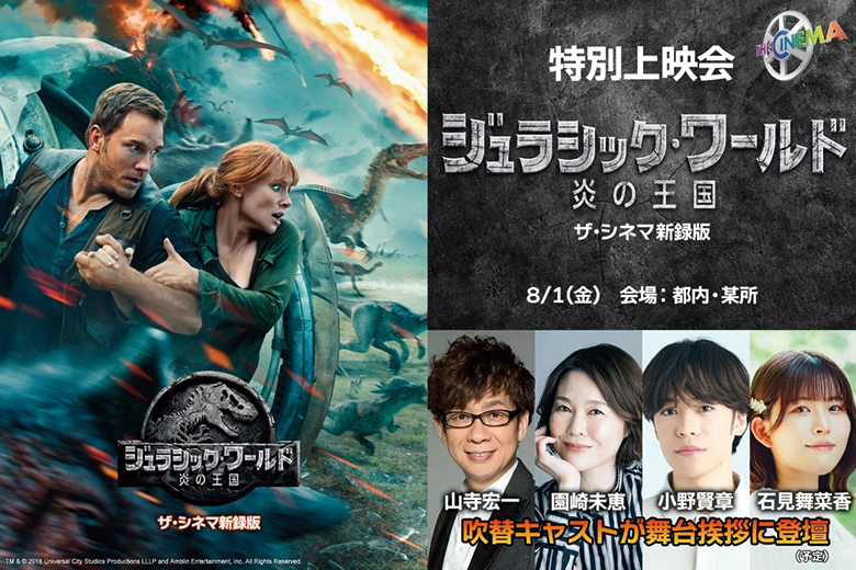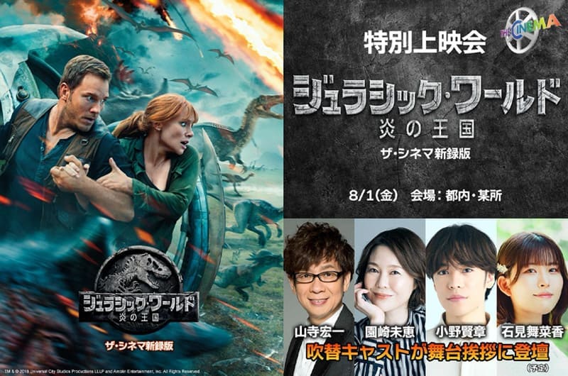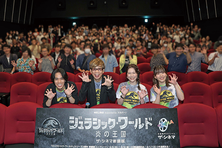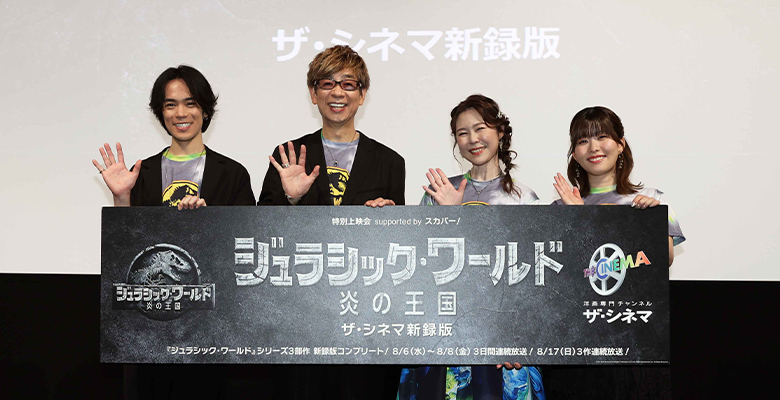 洋画専門チャンネル ザ・シネマが今年2月から独占放送でお届けしている、ザ・シネマオリジナル新録吹替企画。この度、第9弾『ジュラシック・ワールド』シリーズ1作目『ジュラシック・ワールド【ザ・シネマ新録版】』の大きな反響と熱い続編制作のご要望にお応えし、ザ・シネマオリジナル新録吹替企画第10弾として、『ジュラシック・ワールド/炎の王国【ザ・シネマ新録版】』、『ジュラシック・ワールド/新たなる支配者【ザ・シネマ新録版】』が制作され、7月、8月に独占TV初放送。放送を記念して、8月1日(金)に都内にてオーウェン役の山寺宏一、クレア役の園崎未恵、フランクリン役の小野賢章、メイジー役の石見舞菜香が登壇した『ジュラシック・ワールド/炎の王国【ザ・シネマ新録版】』舞台挨拶付き特別上映会を開催いたしました。収録の裏話や、観て欲しいポイントなどが聞けるトークイベント、さらに豪華賞品が当たる抽選会など盛りだくさんでお届けいたしました。